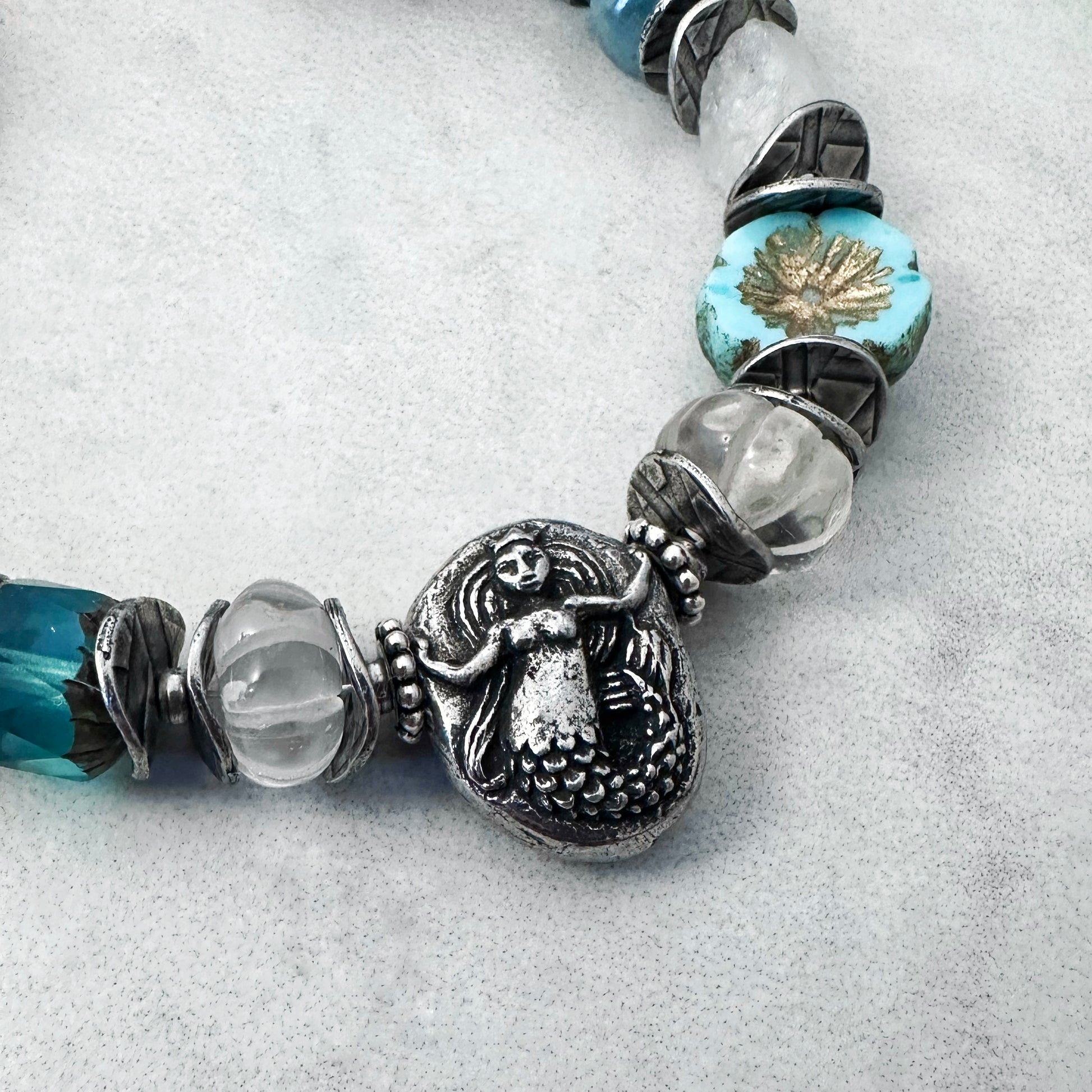 In this bracelet I pulled together various shapes and sizes of crystal quartz, aqua-blue Czech glass, and fluorite, as well as textured pewter discs, finished with two African turquoise barrels and sterling silver findings. The mermaid artisan pewter focal anchors it, imparting a bit of whimsy while adding weight and substance.