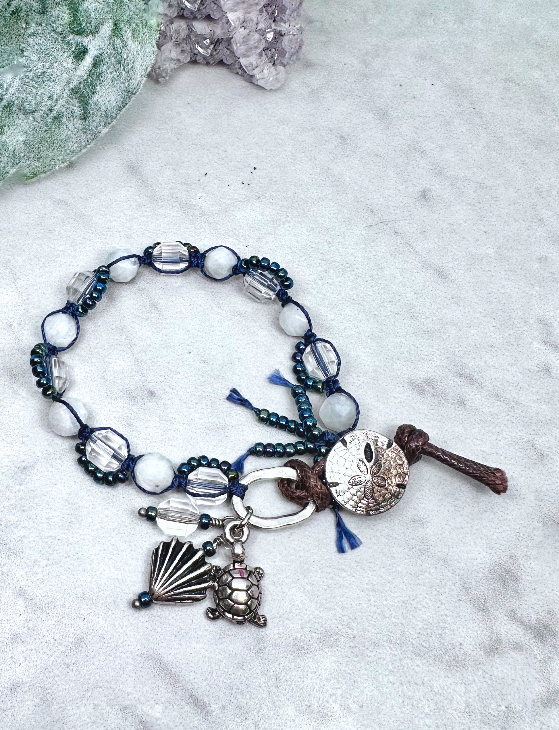 This boho-style macrame bracelet works beautifully stacked or worn on its own. Navy cords, iridescent blue Japanese seed beads, and a mix of creamy white and icy clear stones come together with soft silver accents for a bold, ocean-inspired look that feels right any time of year.